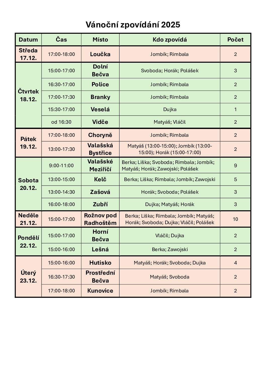 P. Stanislav Matyáš (13:10-15:00) v zákristii P. Pavel Jombík (13:10-15:00) ve zpovědnici P. Bedřich Horák (15:00-17:00) ve zpovědnici a P. Jan Vláčil 13:20-16:50 na faře, pak 17:00-17:20 a po mši … Číst dál